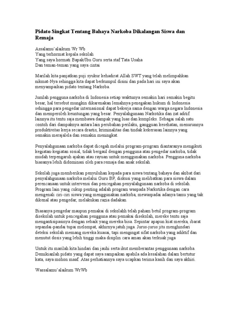Bahaya penyalahgunaan narkoba assalamu'alaikum wr wb yang terhormat kepala sekolah. Tema pidato saya pada hari ini adalah hari pendidikan nasional. And all the young generation that present here. Pidato tentang narkoba ini juga disertai artinya terjemahan dalam bahasa indonesia. Salawat and salam or bleesing and salutation hopefully be delivered by allah swt.